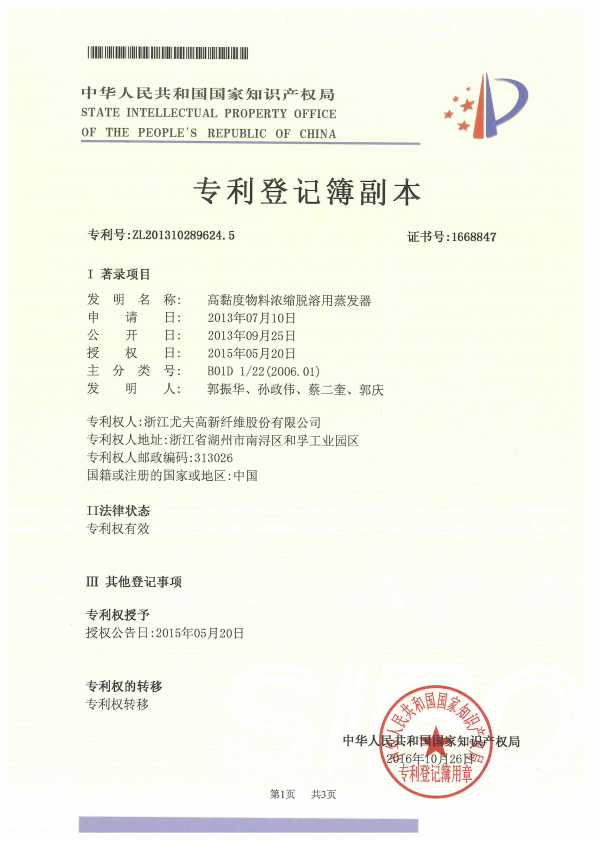 • 高黏度物料濃縮脫溶用蒸發(fā)器 受讓專(zhuān)利登記簿